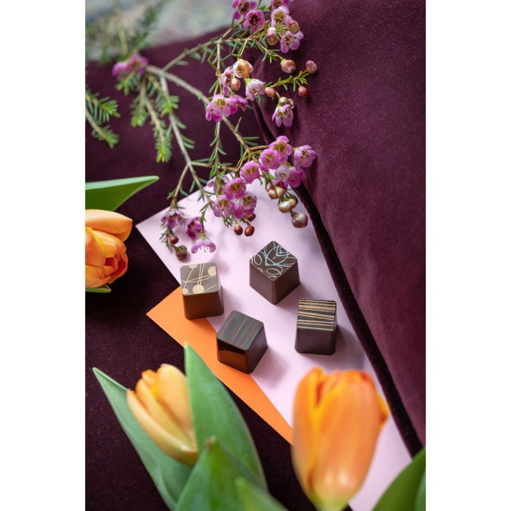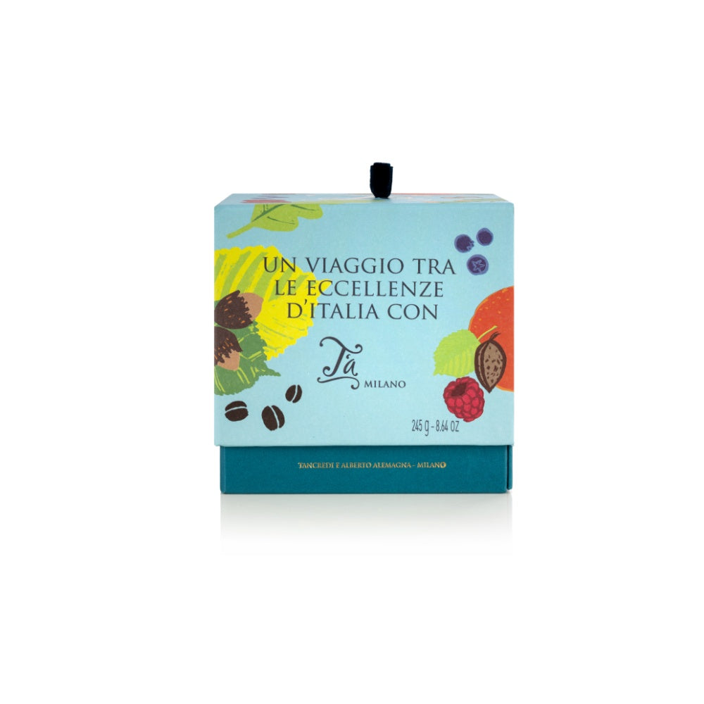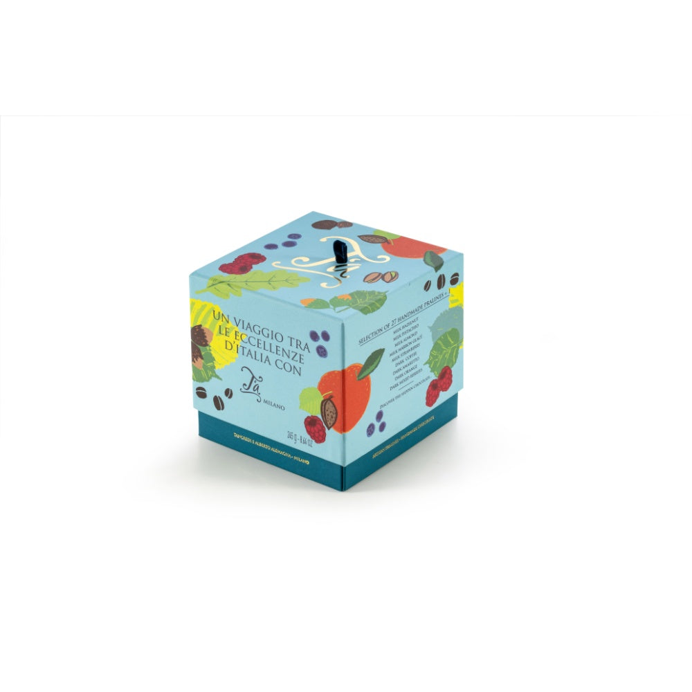 T'a Milano Colorata confezione di 27 gustose praline ripiene su 3 vassoi nelle varianti con cioccolato al latte o fondente e ripieni assortiti, un vero e proprio Viaggio tra le eccellenze d’Italia con la Nocciola Piemonte IGP, il pistacchio e la mandorla di Sicilia, la fragola veneta, i marron glacé piemontesi. E poi lo scrigno nasconde un segreto: un cioccolatino nascosto e un messaggio che si riveleranno solo ai consumatori più golosi!